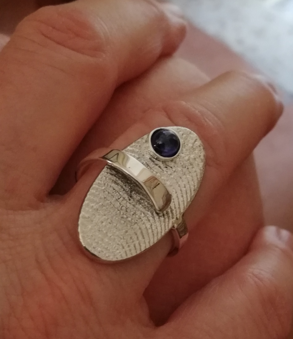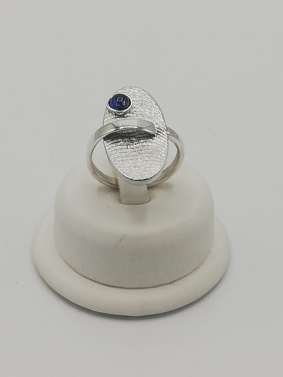 Anello argento realizzato con fusione in osso di seppia e Zaffiro blu (misura regolabile)