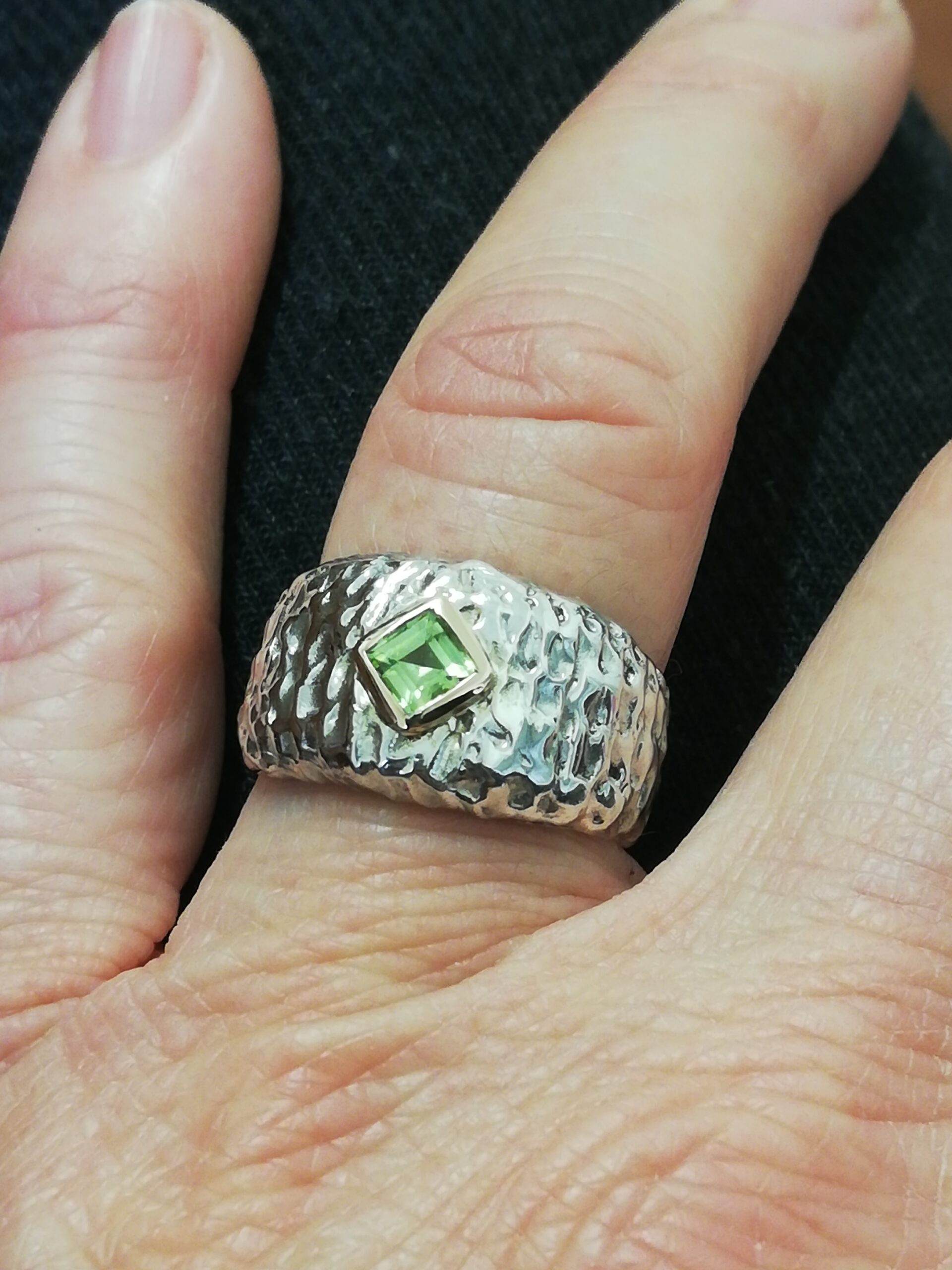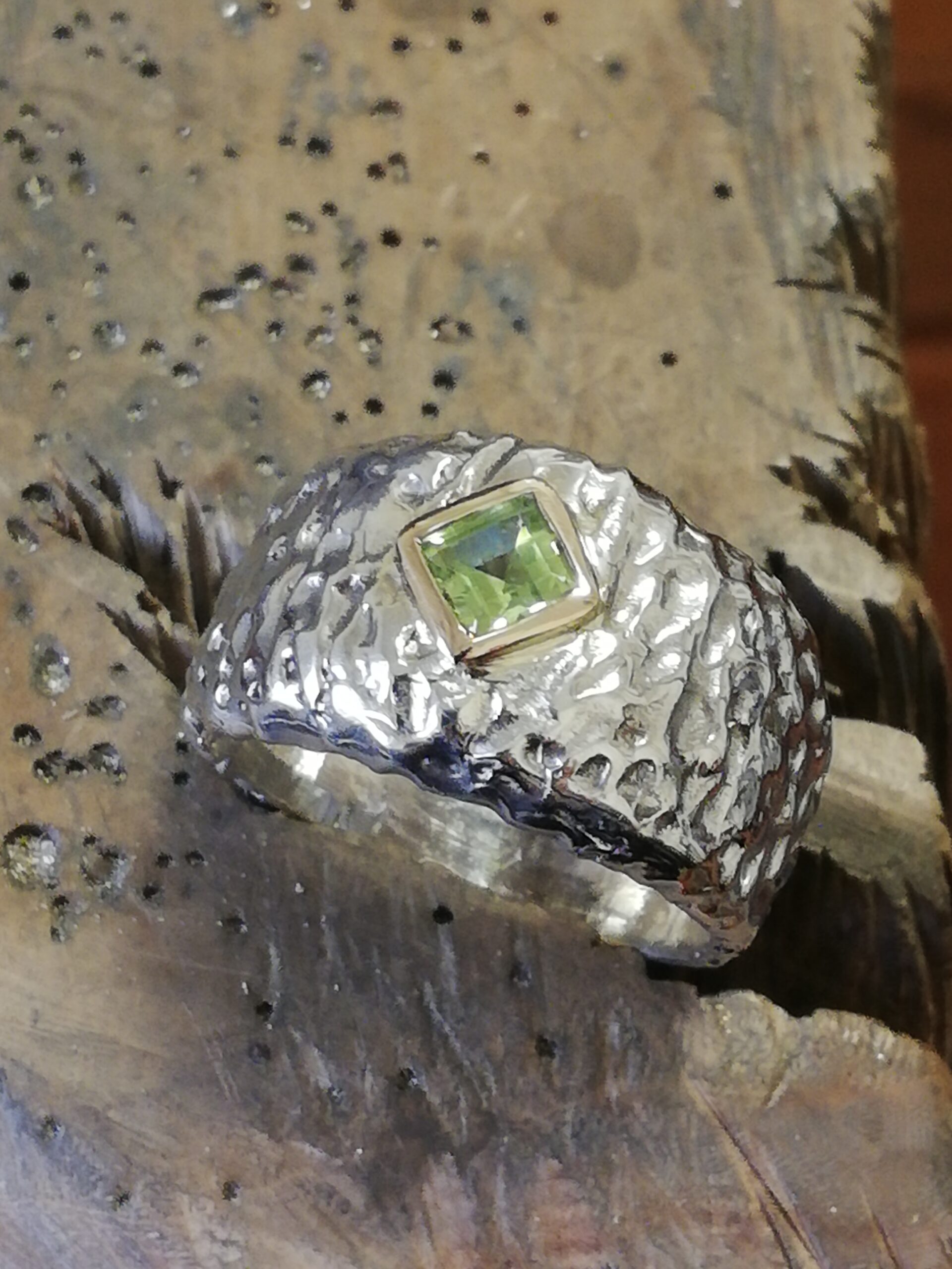 Anello in argento con bordino incassatura in oro giallo, pietra in Peridoto verde