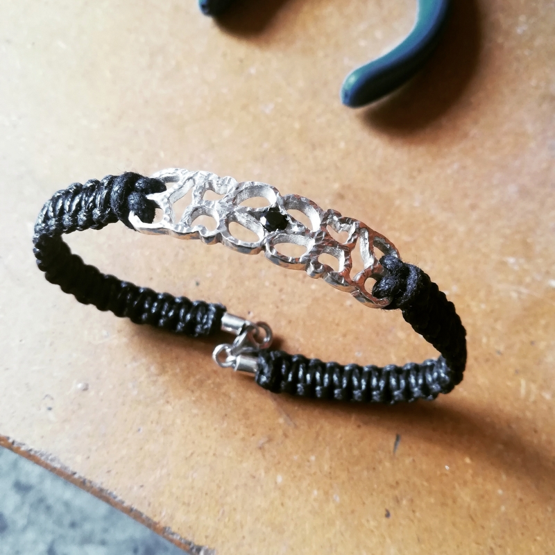 Bracciale con centrale in argento realizzato in microfusione con zaffiro blu e cordoncino intrecciato nero (circonferenza cm22)