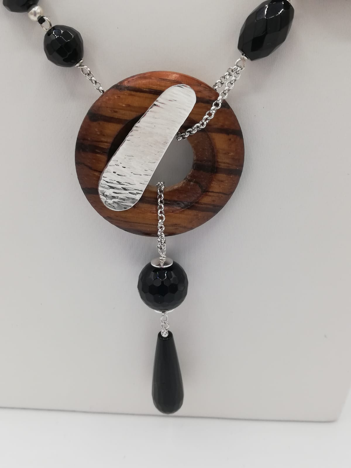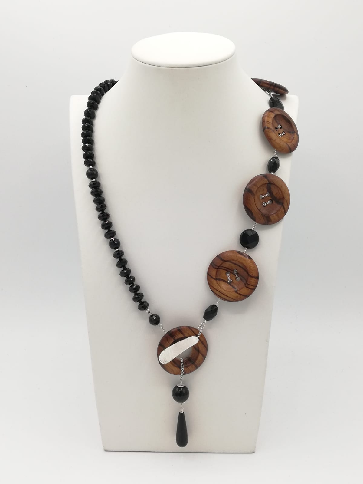 Collana in Onice nero bottoni in legno e catena in argento ( lunghezza cm 62)