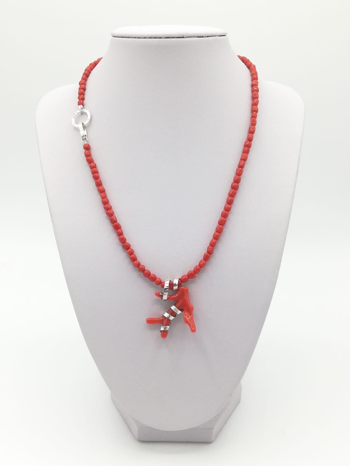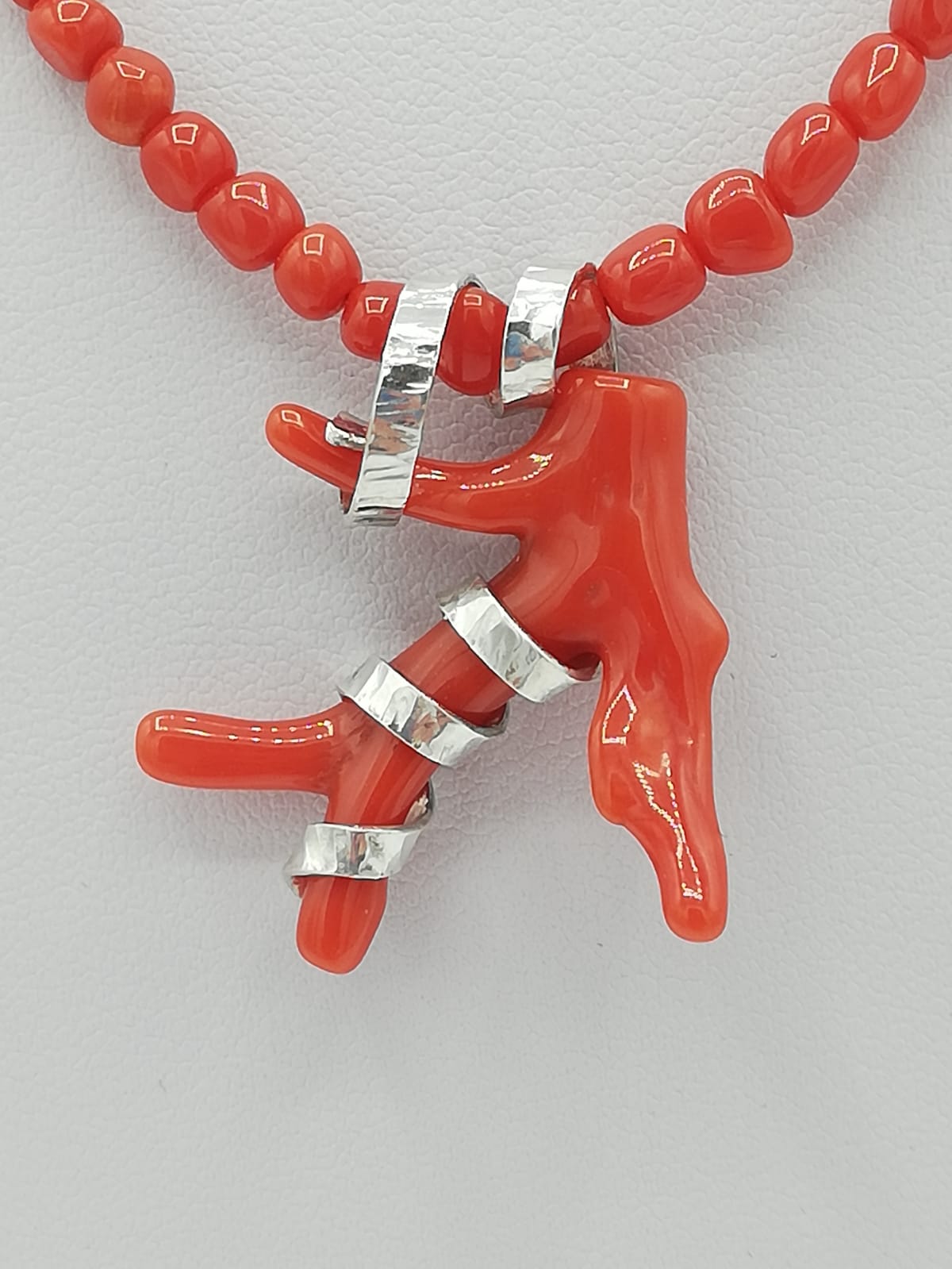 Collana in Corallo rosso naturale con ciondolo a rametto e fascetta in argento martellato