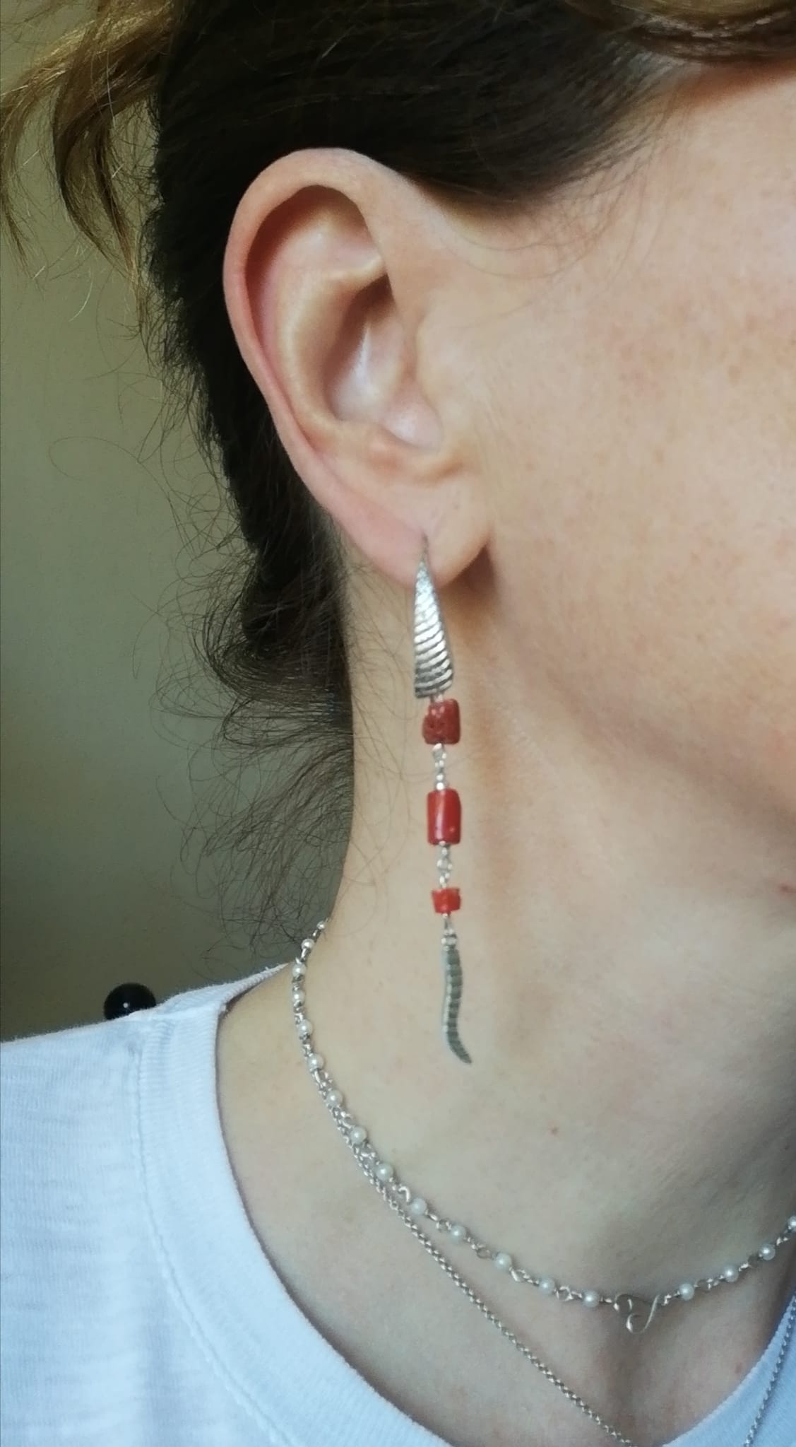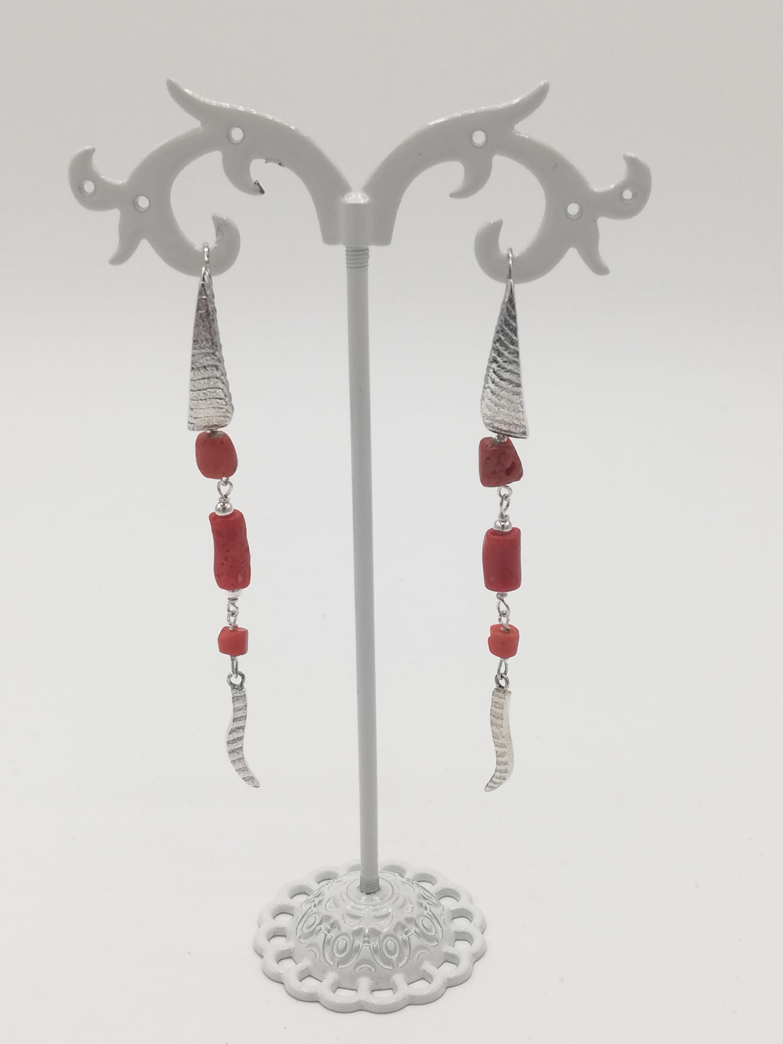 Orecchini in argento realizzati con fusione in osso di seppia e corallo rosso naturale (lunghi cm7,5)