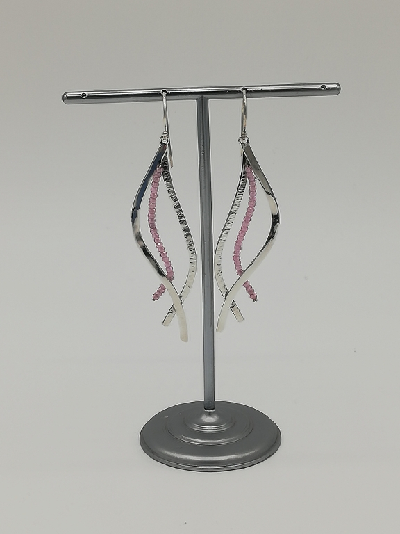 Orecchini due Nastri: realizzati a fili, martellato e lucido, con palline faccettate(da 2mm) di Zircone rosa (lunghi cm 6,8 larghi cm1,6)